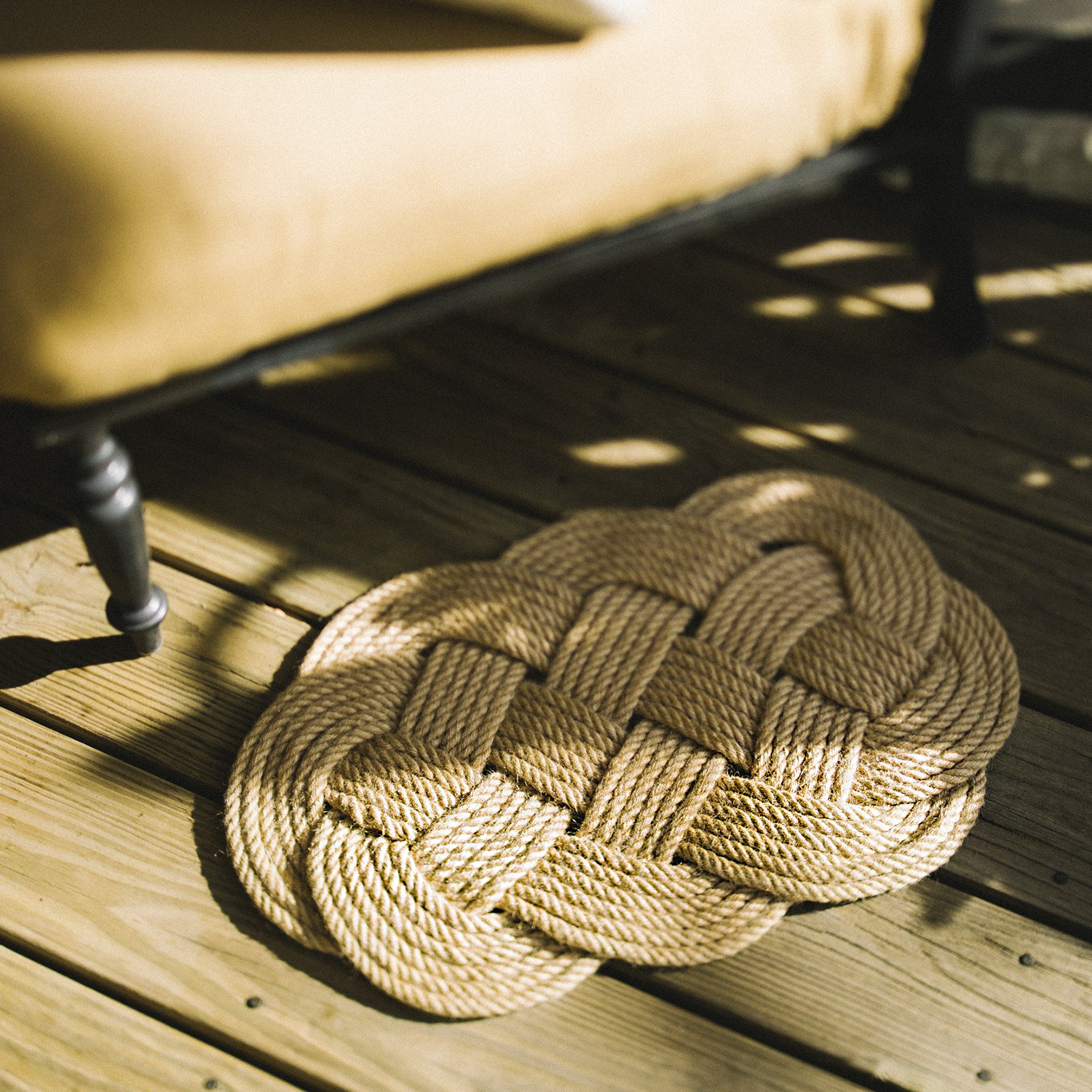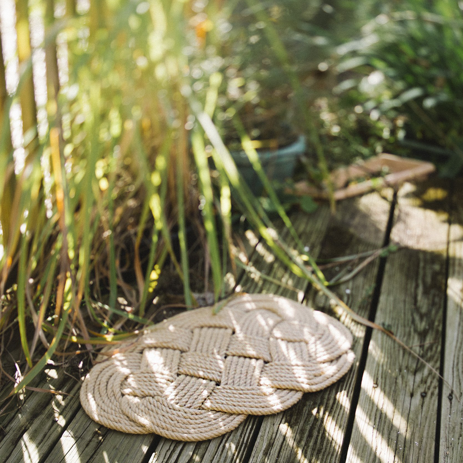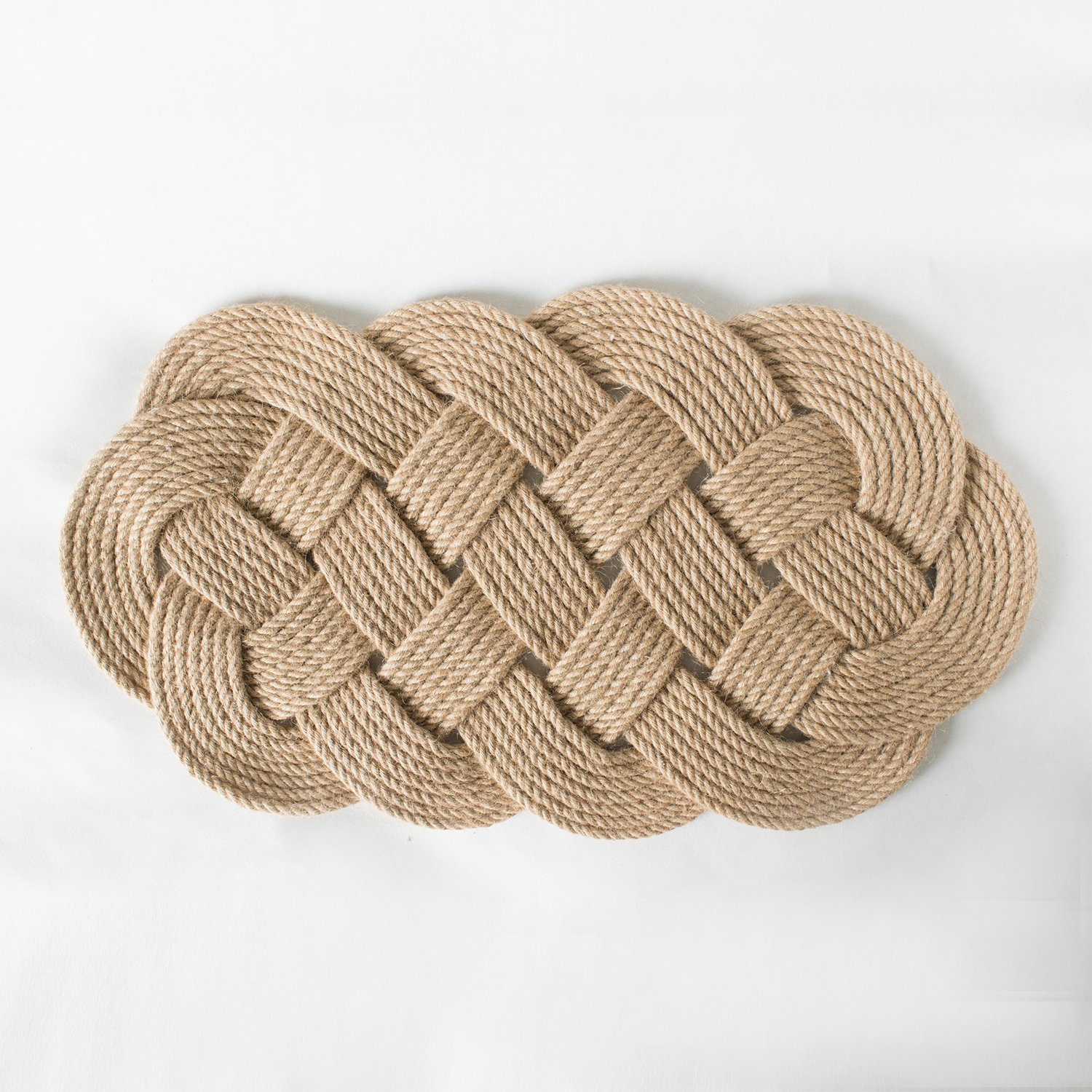 This beautiful oval rug is handmade from a single strand of jute rope and measures approximately 28x16 inches. It makes the perfect outdoor mat!