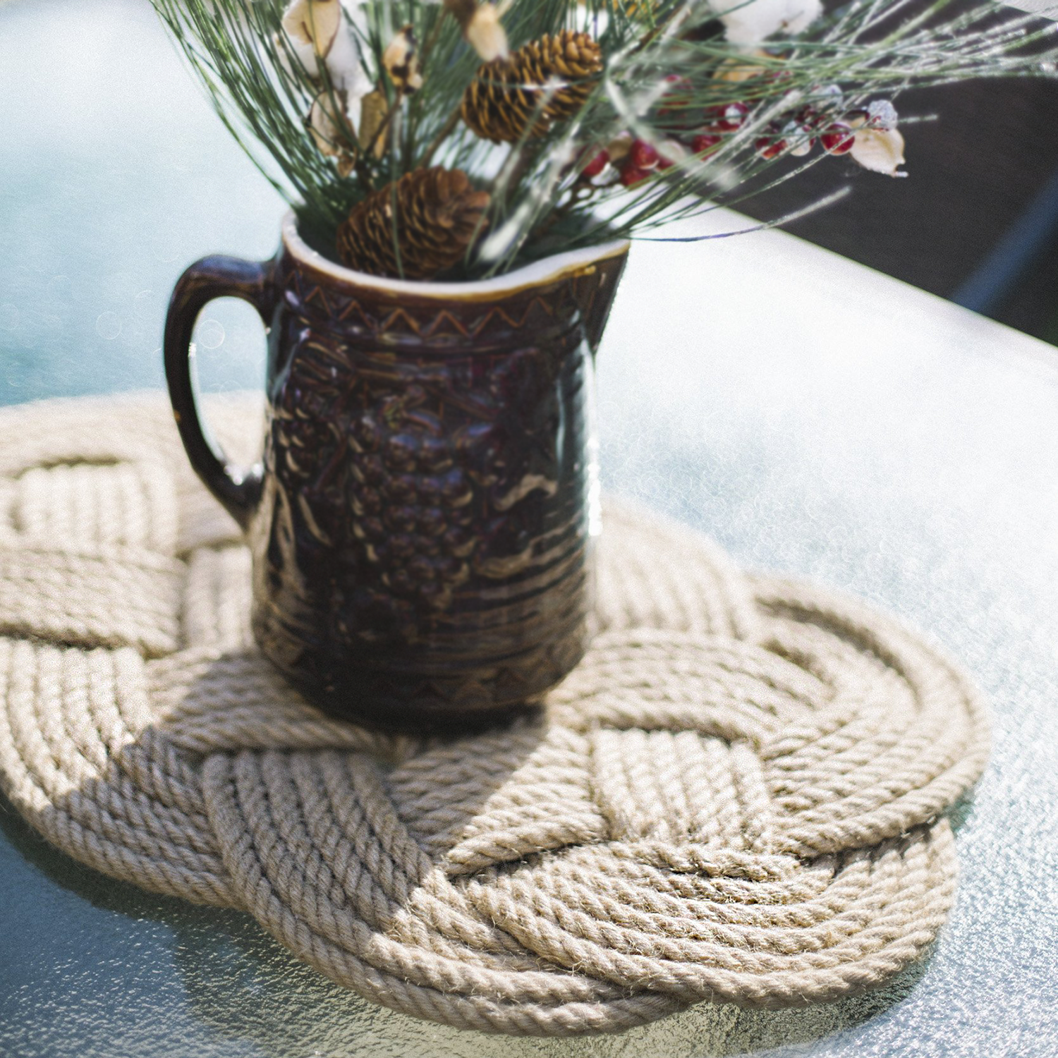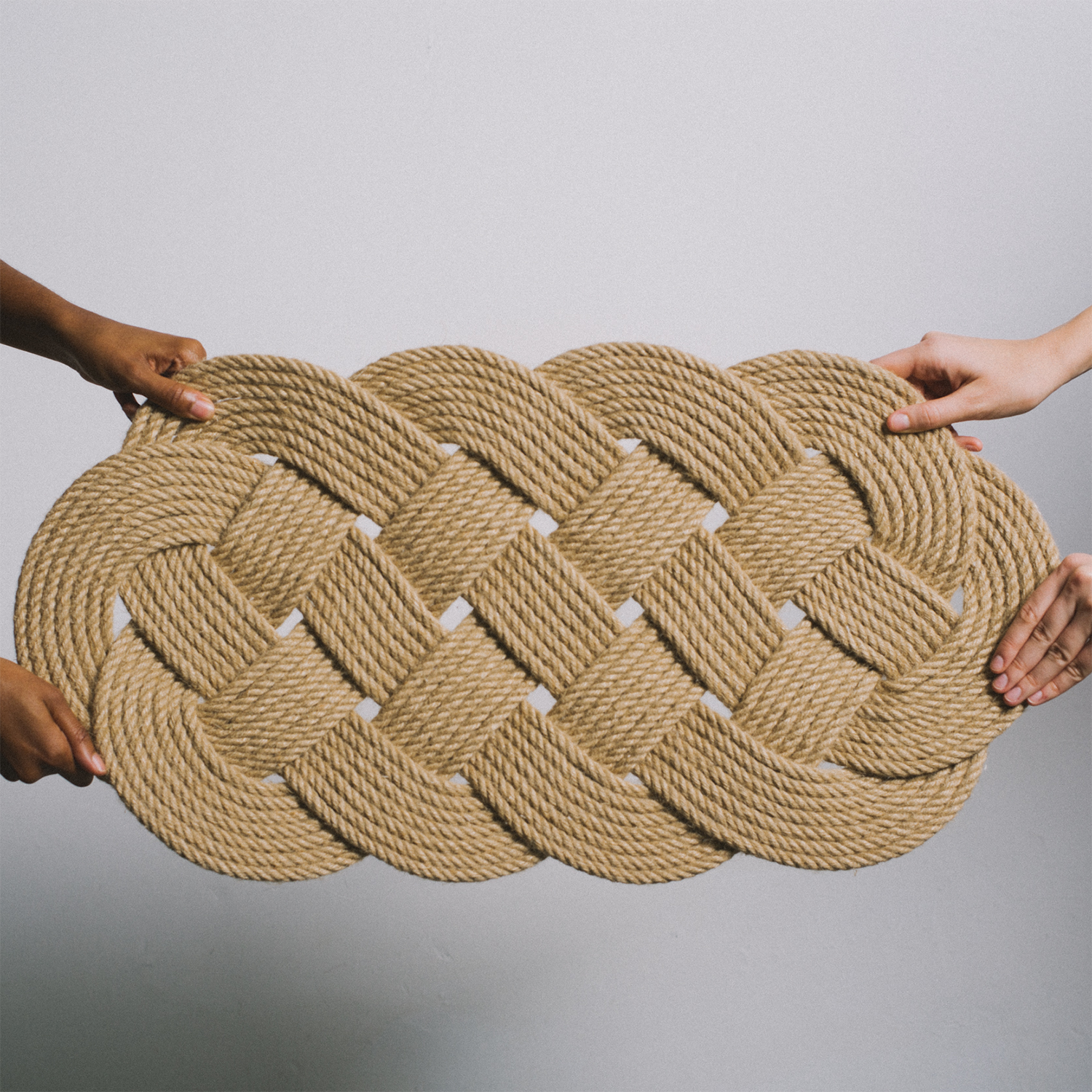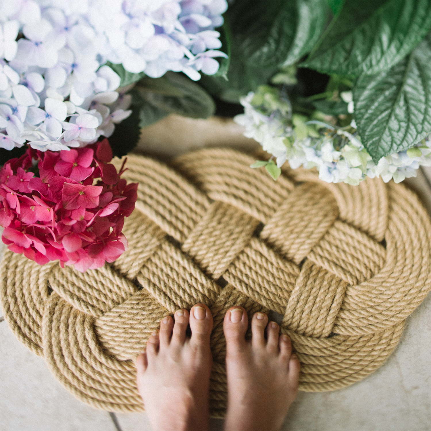 This beautiful oval rug is handmade from a single strand of jute rope and measures approximately 28x16 inches. It makes the perfect outdoor mat!