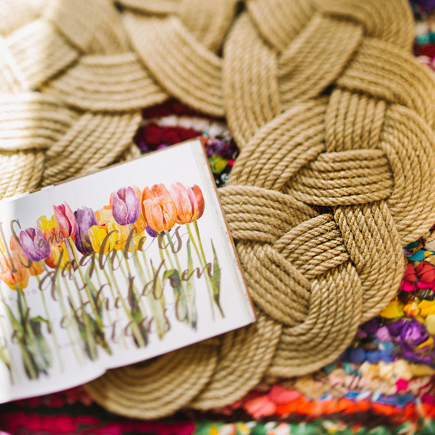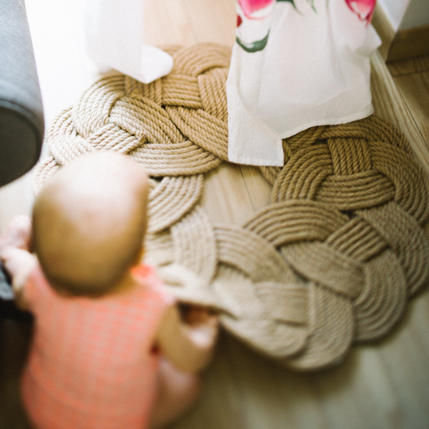 هذه السجادة الصغيرة ذات العقد الدائرية من سجاداتنا المفضلة. مصنوعة من خيط واحد من حبل الجوت الجديد بقطر ١٢ مم. يبلغ قطر السجادة ٢٦ بوصة.